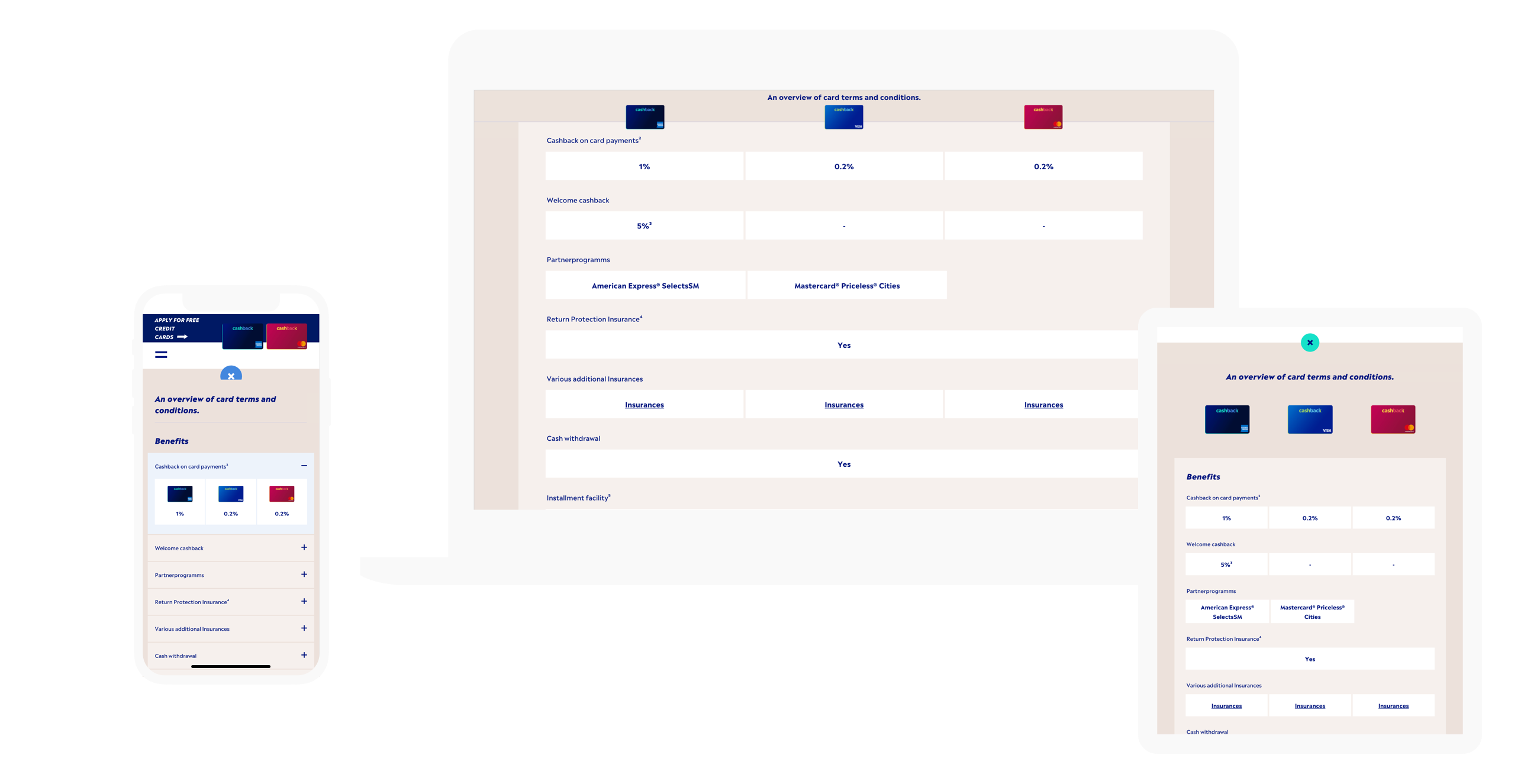 All of the relevant card information one needs to choose from a card duo is listed in a clear interactive table, which adjusts to every breakpoint and device.