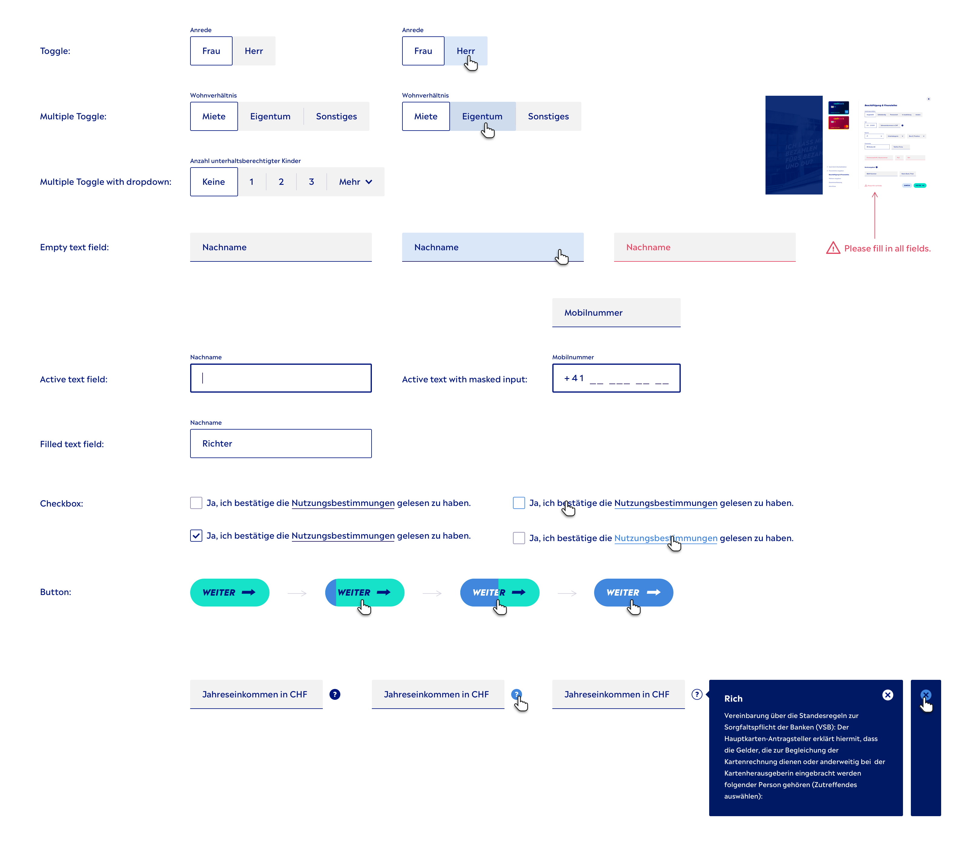 The seamlessly integrated credit-card application process is the centerpiece of the landing page. It is accessible from anywhere within one click through the sticky cards-teaser. The process was completely restructured to improve the user experience and such reduce drop-off rates. It was divided into 5 meaningful steps, ever present for the user.